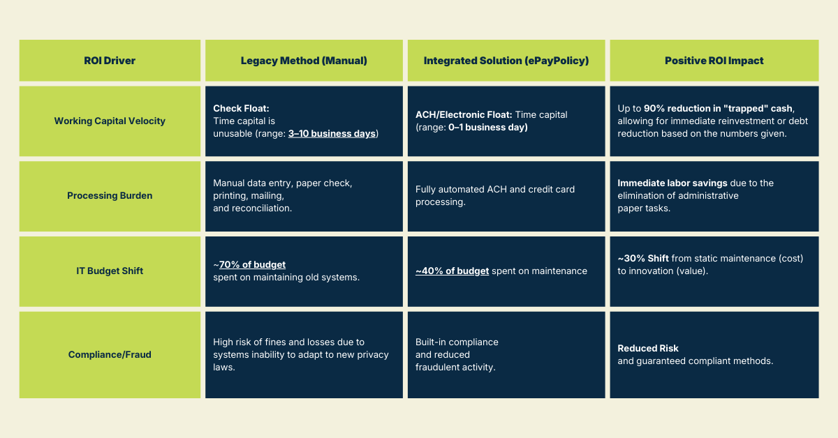 - Velocity ROI: Ditch the “interest-free loan” to the postal service. Working capital moves in 24–48 hours instead of weeks, keeping your funds liquid as they move up and down the insurance chain.