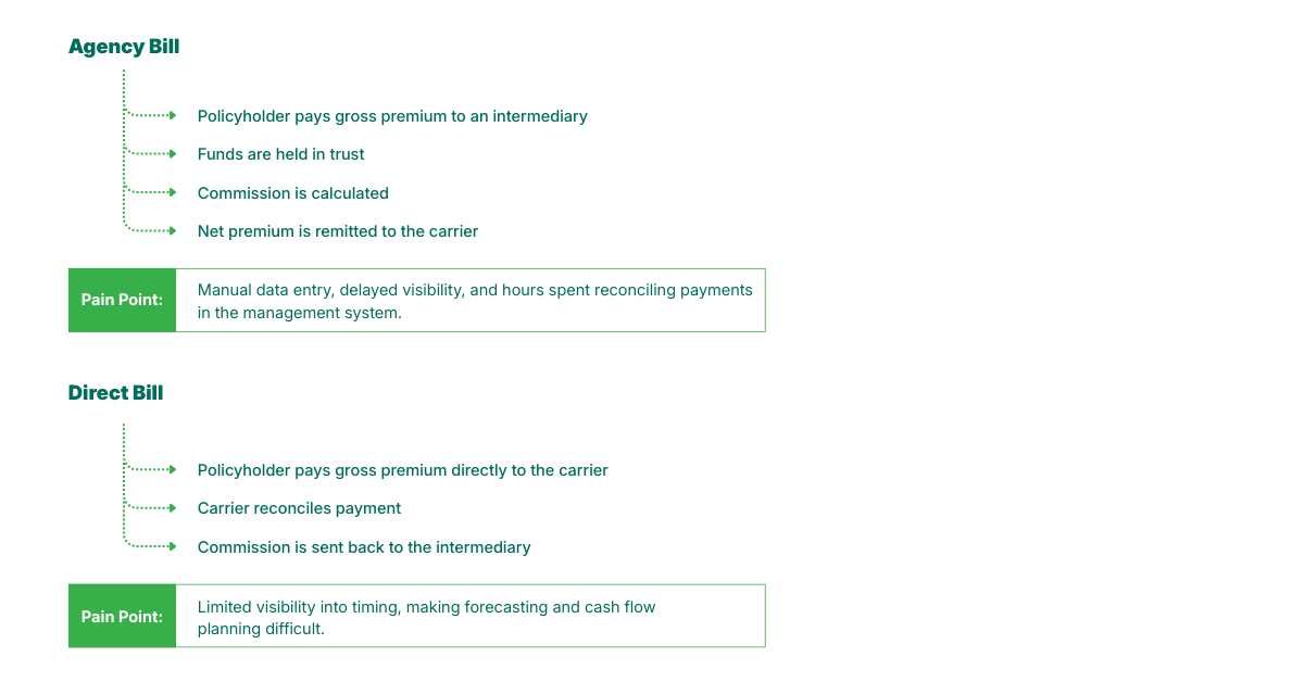 - Agencies & MGAs: The navigators. They sit at the center of the relay, managing gross collections, commission splits, and complex tax remittances. Their risk is fiduciary and operational; they are responsible for money that isn’t theirs, often without the real-time data to back it up.